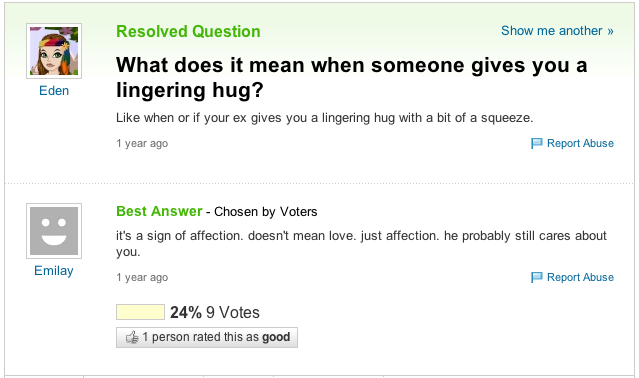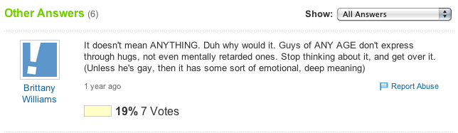 I don’t know if you can tell, but I’ve been thinking a lot about boobs and men and hugs. I wouldn’t normally give these things so much thought, but, while trolling my favorite website for life’s greatest answers (Yahoo! Answers UK & Ireland) I realized how these three things are so intertwined.