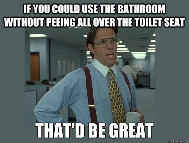 Hi. How are you? That’s nice. How am I doing? Well, not so great. You see, you have sprayed urine all over the toilet seat and didn’t have the wherewithal to wipe it down before you exited the stall. Thanks for asking.