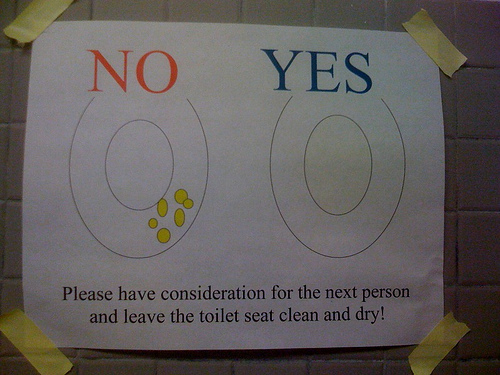 1. It’s possible that the offender grew up in a country where squat toilets were the rule, including many Asian countries. A friend of mine was in Singapore, and said many women squat on the toilet seat to go. But leaving a mess is never acceptible, I don’t care where you’re from.